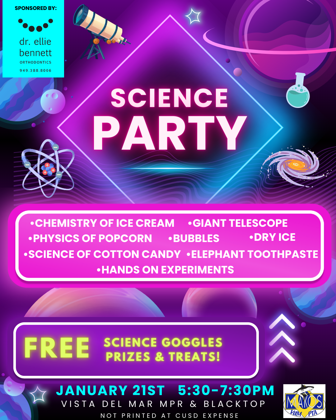 Join us at the VdM Blacktop and MPR for a Science Party! We’ll have hands-on chemistry experiments, a giant outdoor telescope as well as a chance to enjoy the science of ice cream, cotton candy, popcorn and bubbles! Don't miss your chance to win prizes and more!